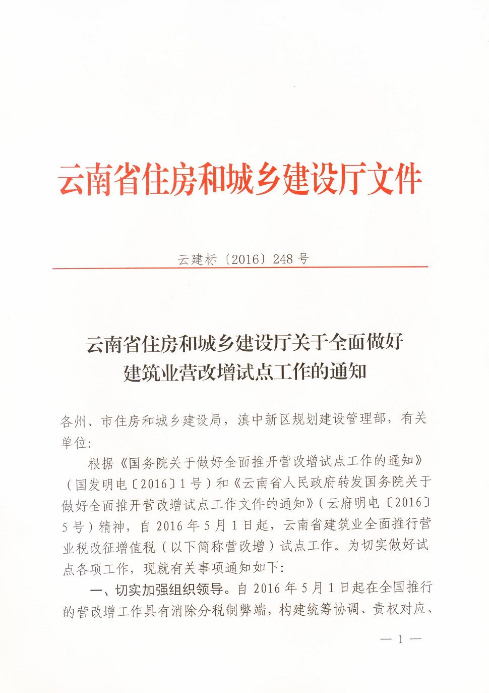 關于全面做好建筑業(yè)營改增試點工作的通知 云建標[2016]248號