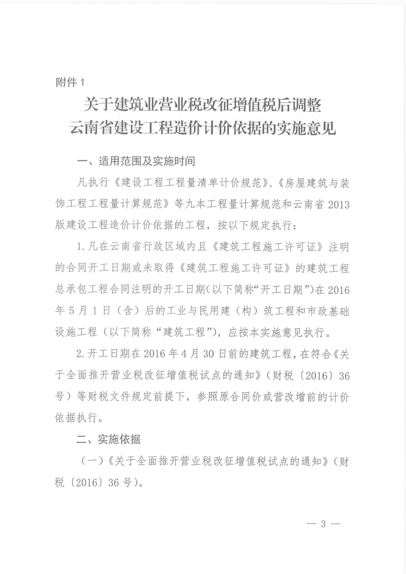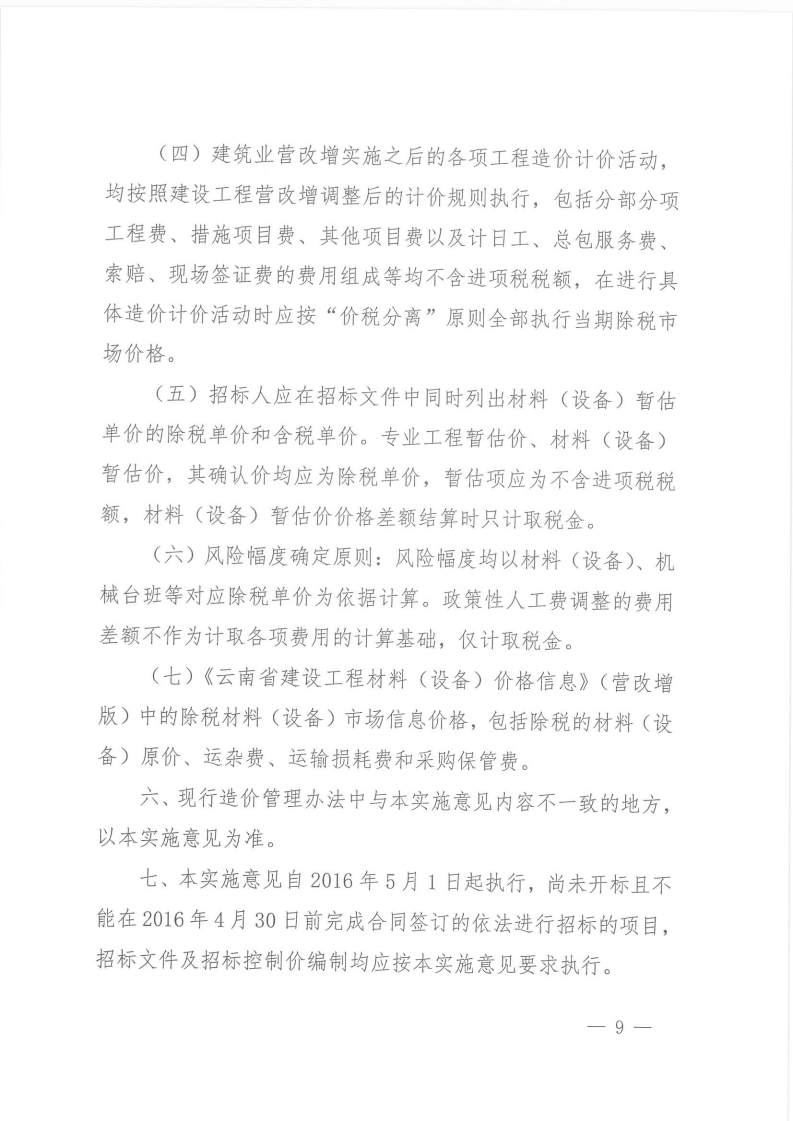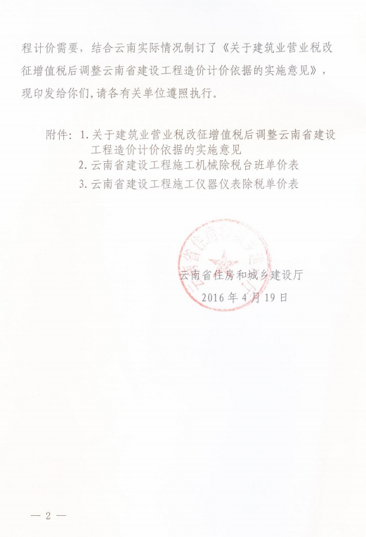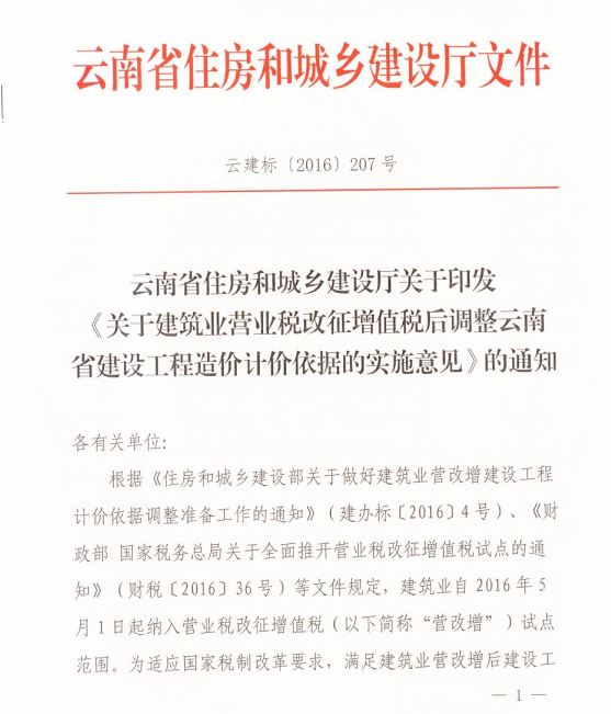 關于建筑業(yè)營業(yè)稅改征增值稅后調(diào)整云南省建設工程造價計價依據(jù)的實施意見的通知 云建標[2016]207號