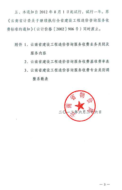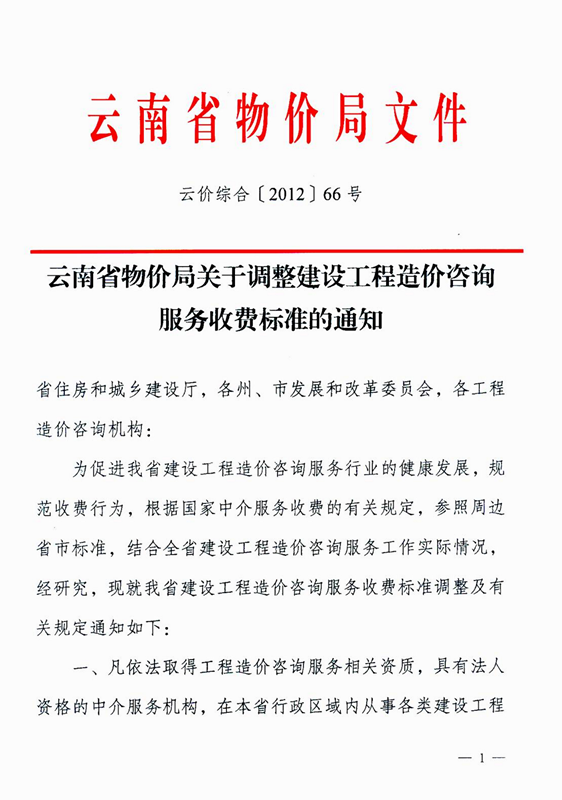 云南省物價局關于調整建設工程造價咨詢服務收費標準的通知 云價綜合[2012]66號