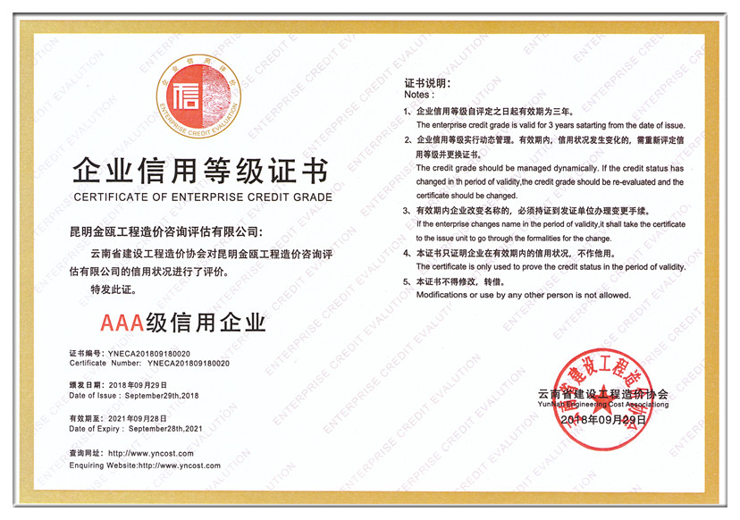 2018年9月29日,中國建設(shè)工程造價(jià)管理協(xié)會對昆明金甌工程造價(jià)咨詢評估有限公司的信用狀況進(jìn)行了評價(jià),評定金甌公司為,并頒發(fā)了“企業(yè)信用等級AAA級信用企業(yè)”等級證書。